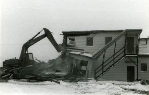 Rec hall being torn down by backhoe